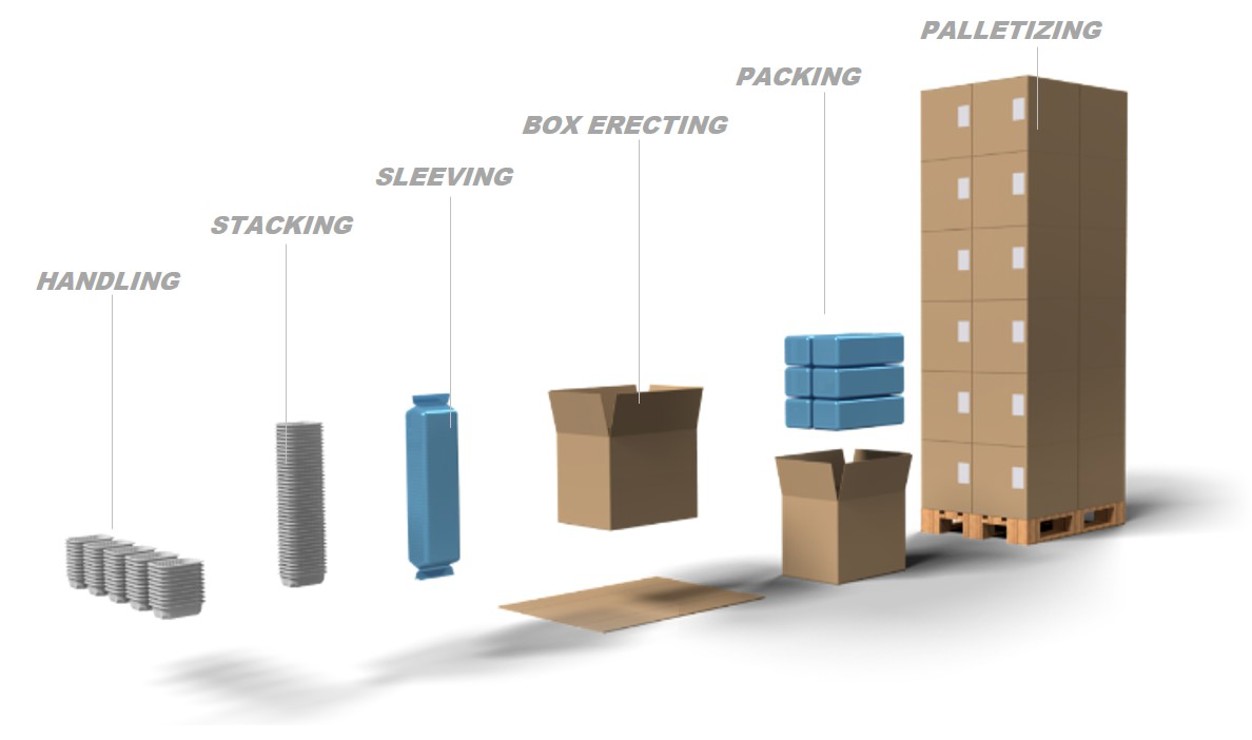 Our innovative packing and palletizing machines automate many tasks in a small space while simultaneously handling a large number of product variants.